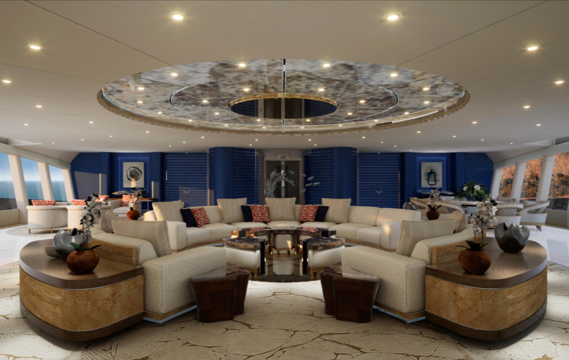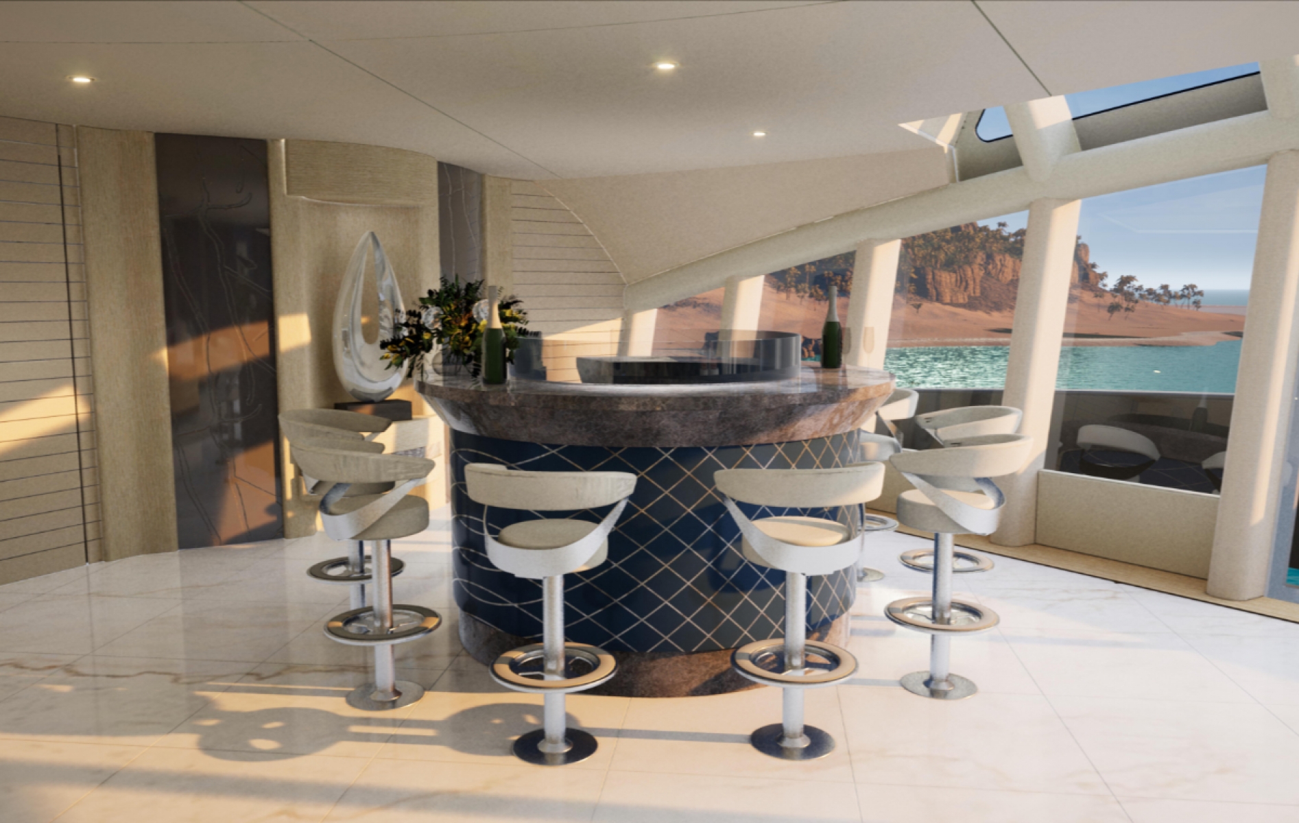 When an owner and their guests are ready to move the party outside, the aft main deck is ready to entertain with the key exterior element being a cantilevered swimming pool that includes a glass window facing out to sea. This water feature is complemented with casual dining and exterior seating together with an enclosed aft lounge. Meanwhile the lower deck includes a generous beach club and wellness centre with gym and cinema.