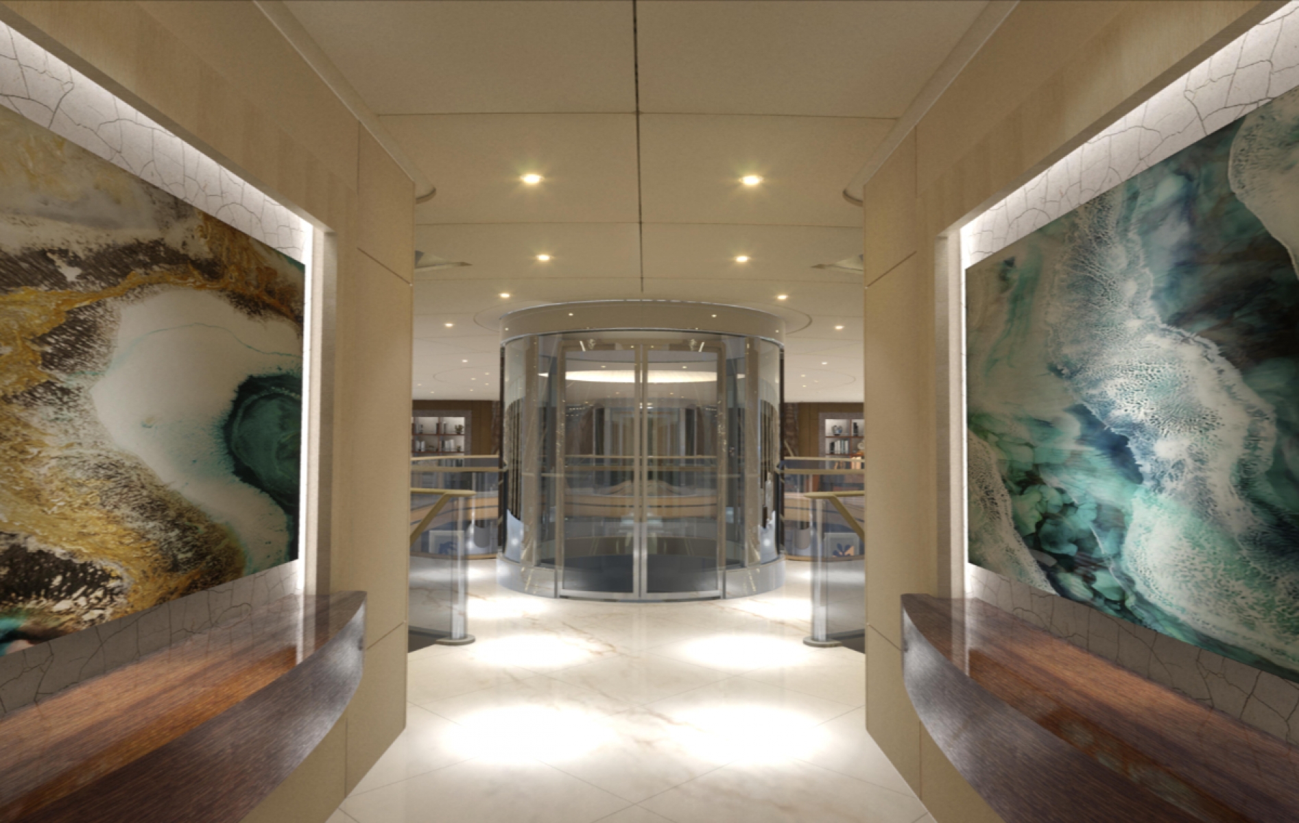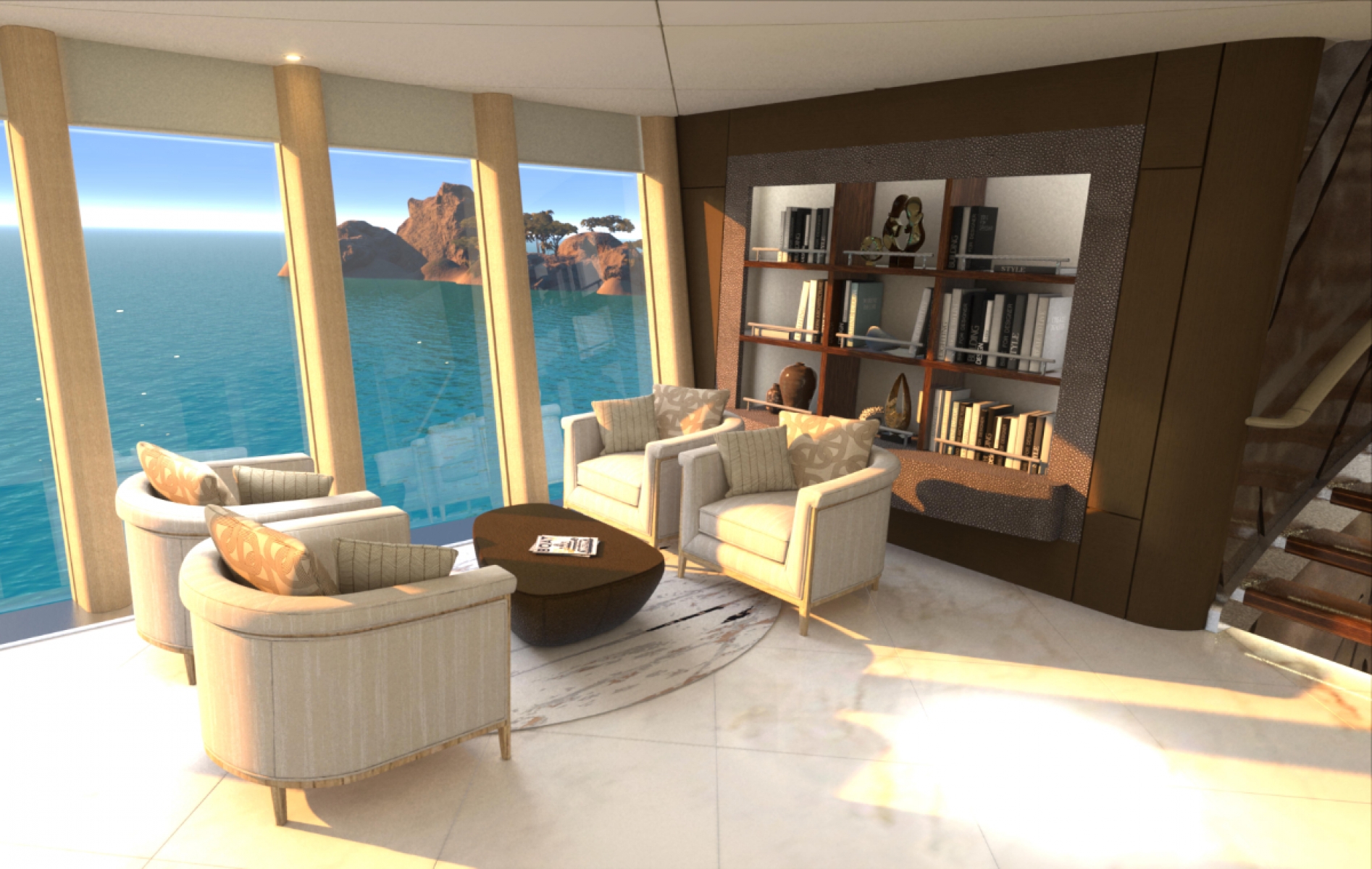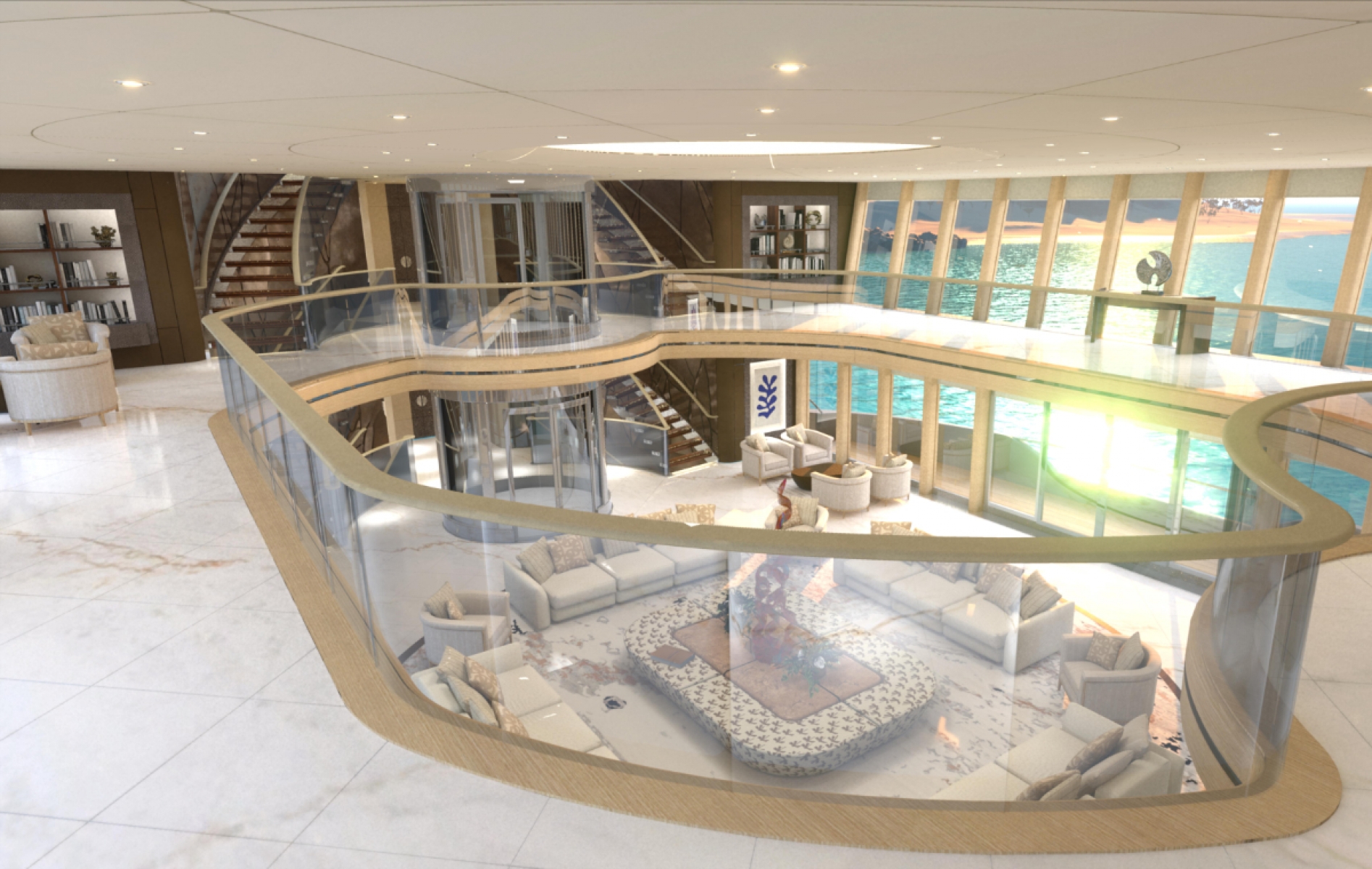 Pockets of intimate seating on the upper mezzanine level provide views over the main saloon while floor-to-ceiling angled windows ensure panoramic ocean scenes without reflections. These full-height windows over two decks conjure an immense connection to the sea. While at the flick of a switch it can be made private thanks to the LCD switchable glass and blinds that extend from the floor or the ceiling as desired.