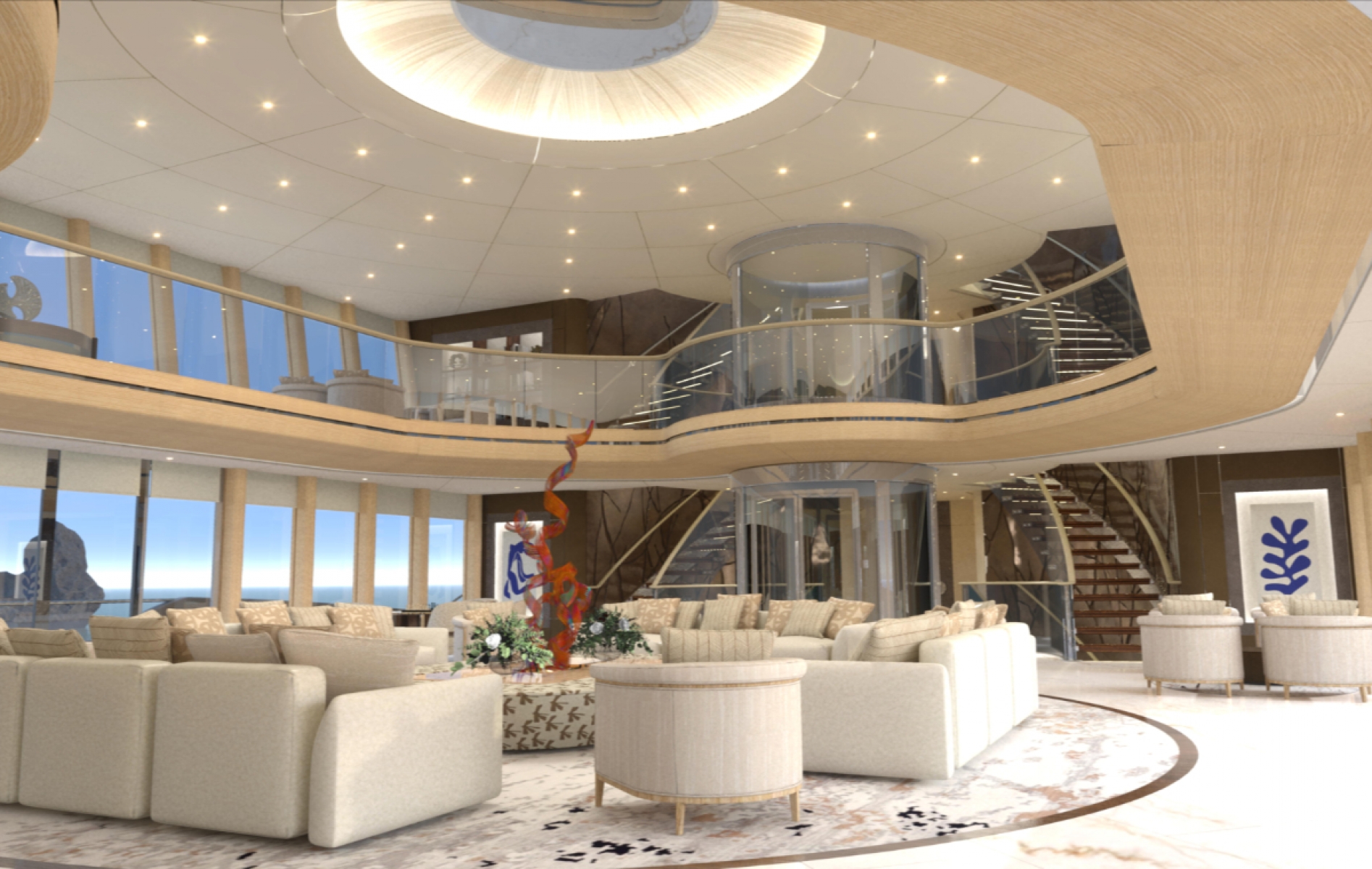 Elegant staircases around glass elevators connect the two levels of the main saloon, ensuring unobstructed views into the space at all times.